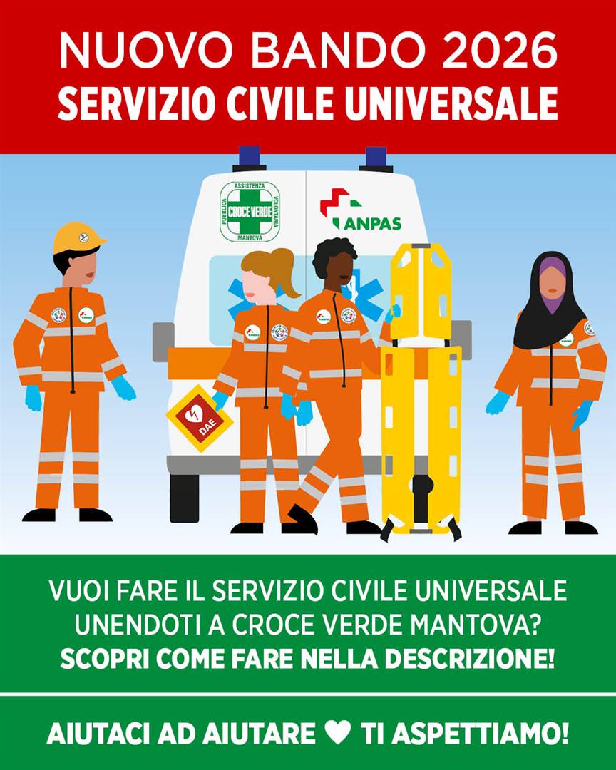 Una grande opportunità per i giovani dai 18 ai 28 anni di età Croce Verde Mantova offre 10 posti per partecipare al nuovo progetto di SERVIZIO CIVILE UNIVERSALE che si svolgerà nell’anno 2026/2027. Se sei interessato a partecipare, qui sotto trovi tutti i dettagli: